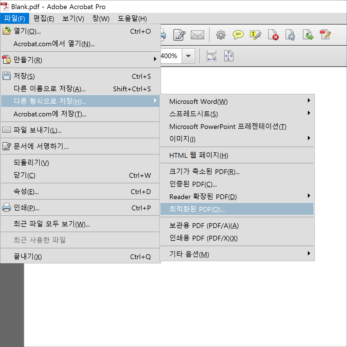 "애크로뱃에서 최적화된 PDF로 저장할 때 아무 오류 메시지 없이 튕깁니다"