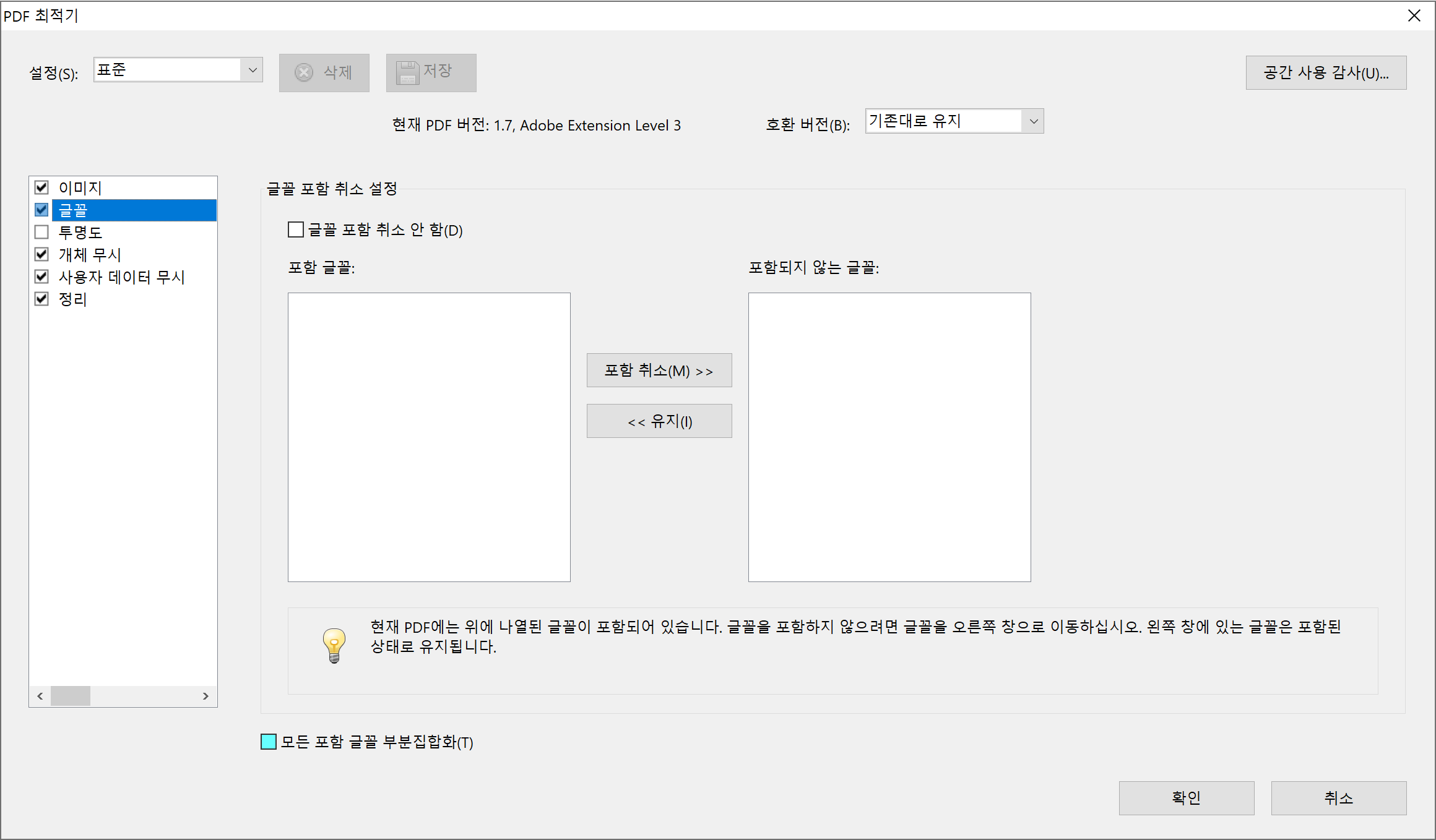 1) 모든 포함 글꼴 부분집합화(Subset All Embedded Fonts) : 체크 해제