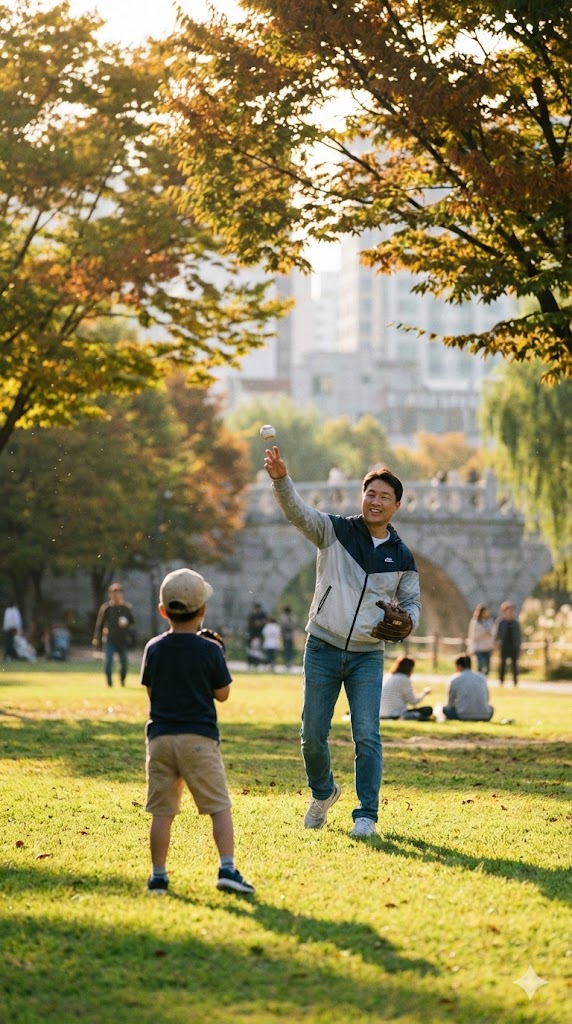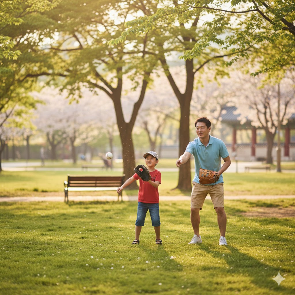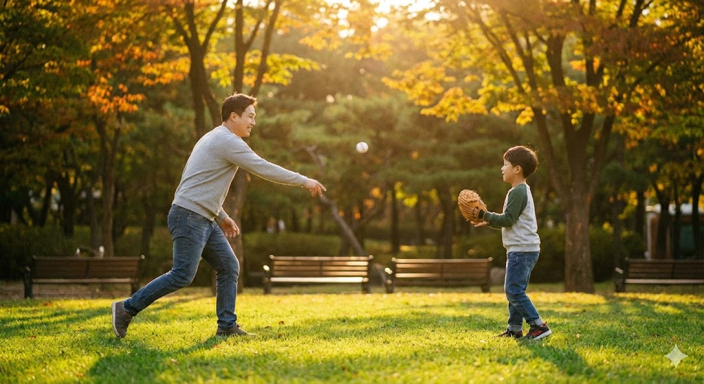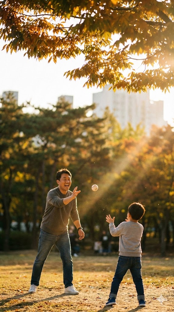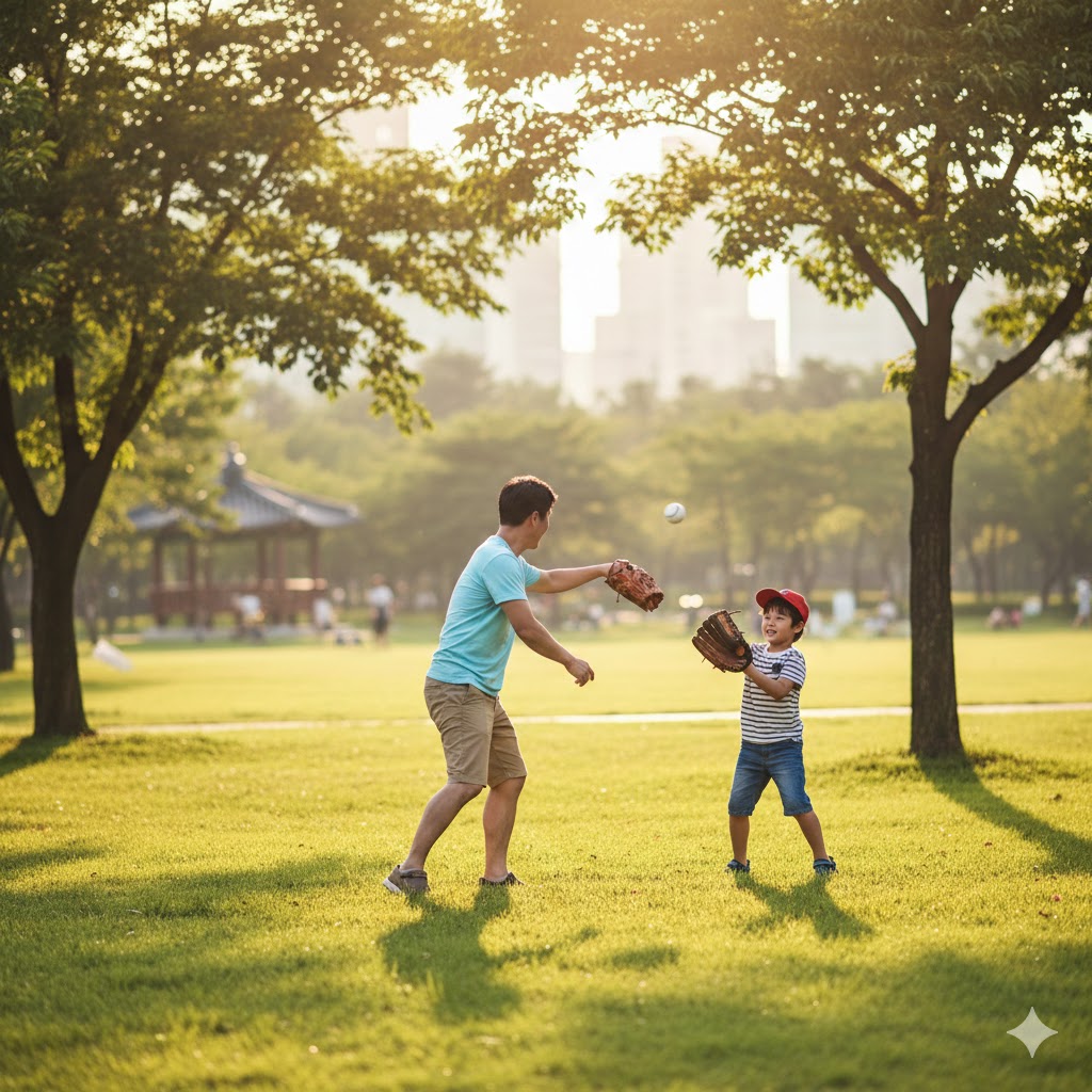 캐치볼을 하는 아빠와 아들의 모습을 사실적으로 묘사한 샷. 따뜻한 햇살을 받으며 먼 거리에서 아빠가 아들에게 공을 던지는 모습. 오후의 햇살이 나뭇잎 사이로 부드럽게 쏟아져 들어오는 서울의 한적한 공원을 배경으로 한다. 햇빛은 부드럽고 따뜻한 분위기를 연출하며, 풀밭의 녹색과 인물들의 움직임을 강조한다. 망원 렌즈로 촬영하여 배경은 부드럽게 흐려지고, 캐치볼의 역동적인 순간에 초점을 맞춘다.