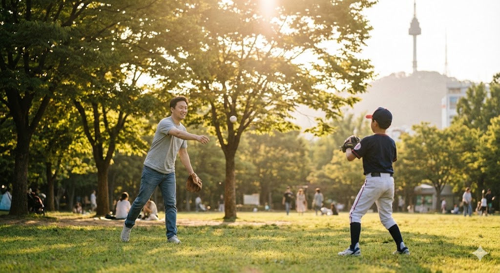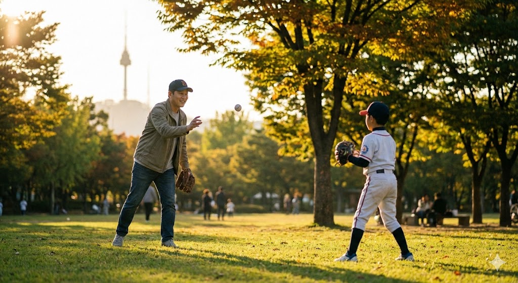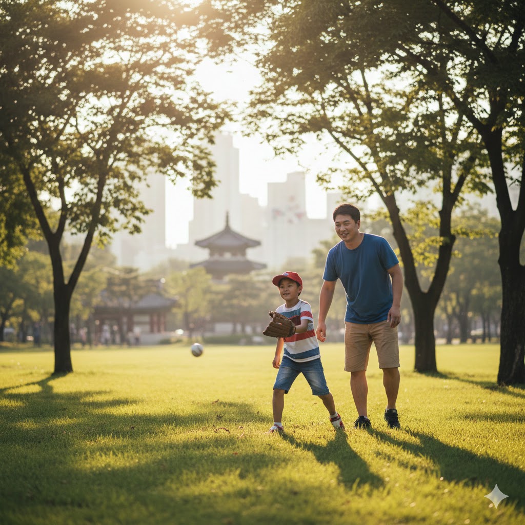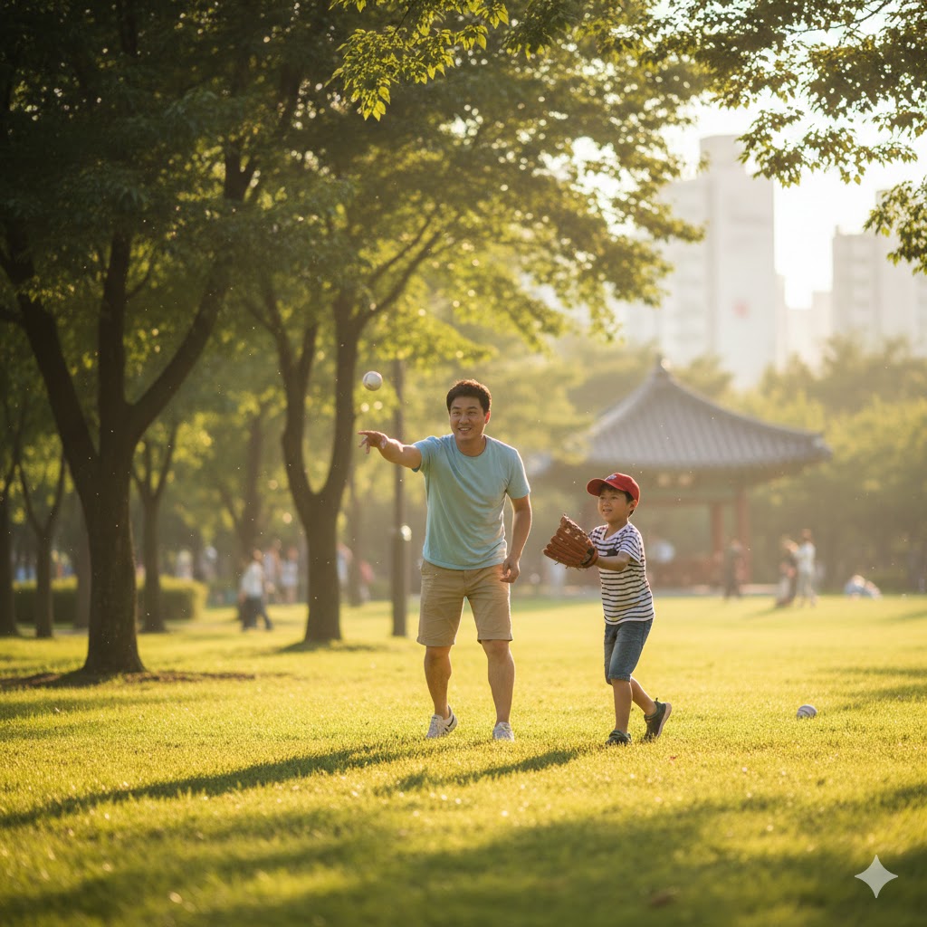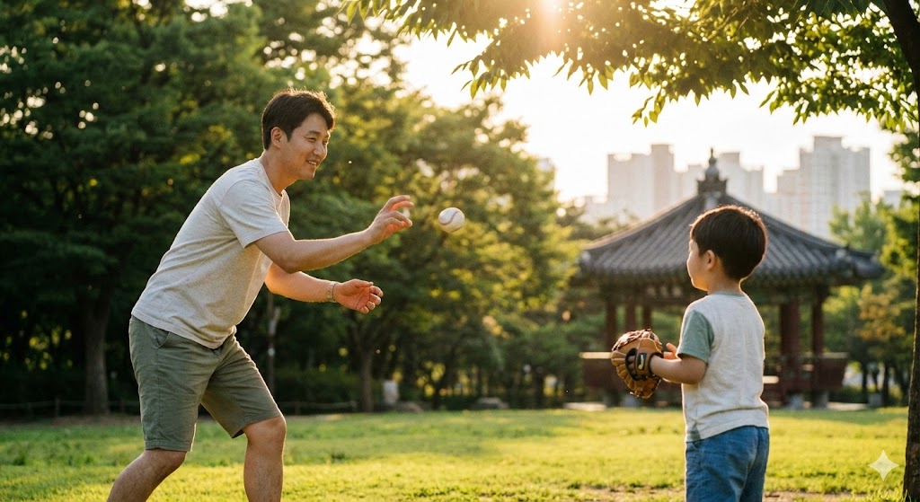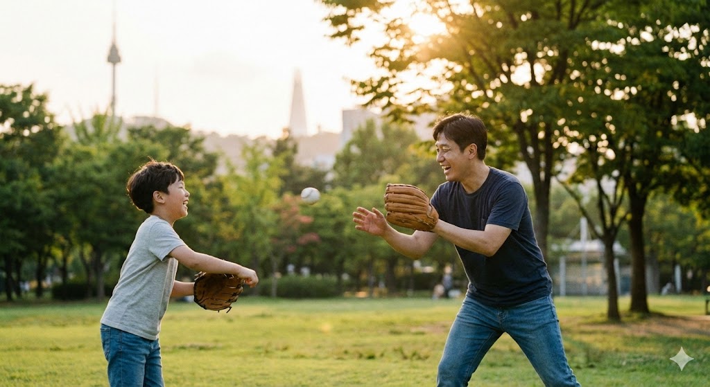 캐치볼을 하는 아빠와 아들의 모습을 사실적으로 묘사한 샷. 따뜻한 햇살을 받으며 먼 거리에서 아빠가 아들에게 공을 던지는 모습. 오후의 햇살이 나뭇잎 사이로 부드럽게 쏟아져 들어오는 서울의 한적한 공원을 배경으로 한다. 햇빛은 부드럽고 따뜻한 분위기를 연출하며, 풀밭의 녹색과 인물들의 움직임을 강조한다. 망원 렌즈로 촬영하여 배경은 부드럽게 흐려지고, 캐치볼의 역동적인 순간에 초점을 맞춘다.