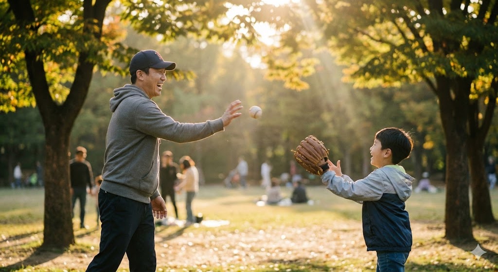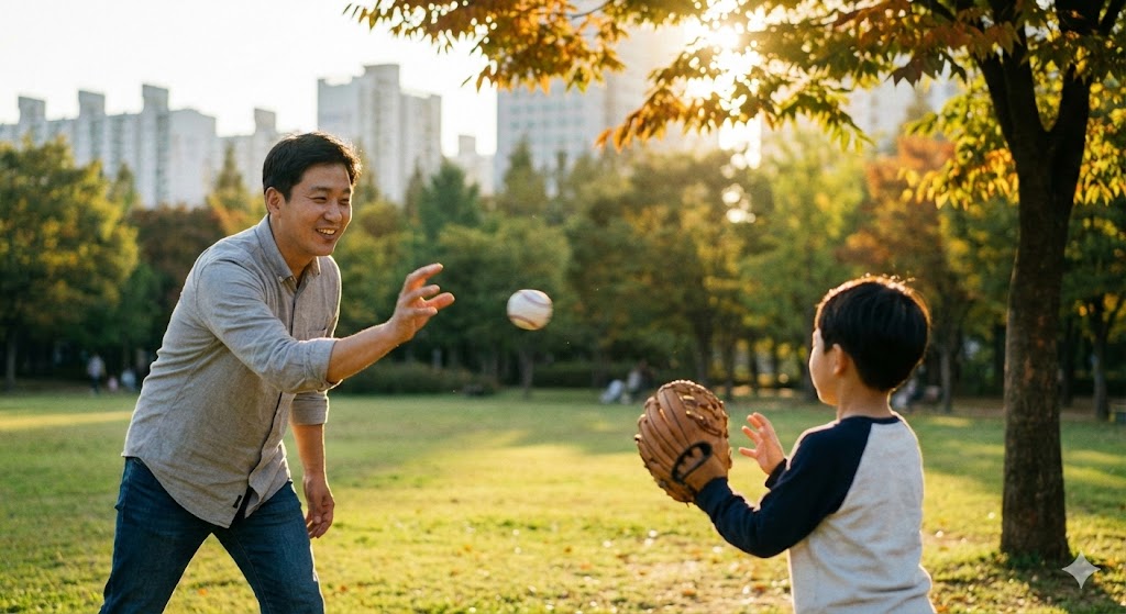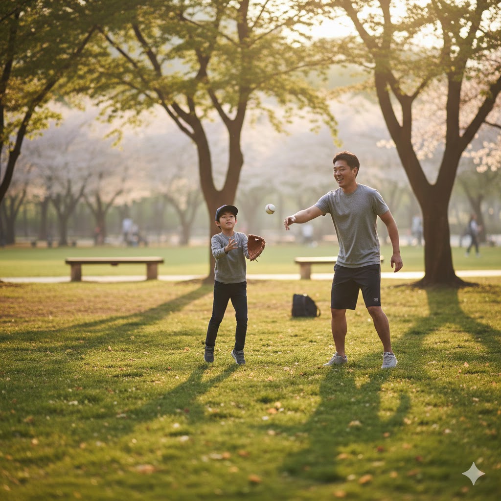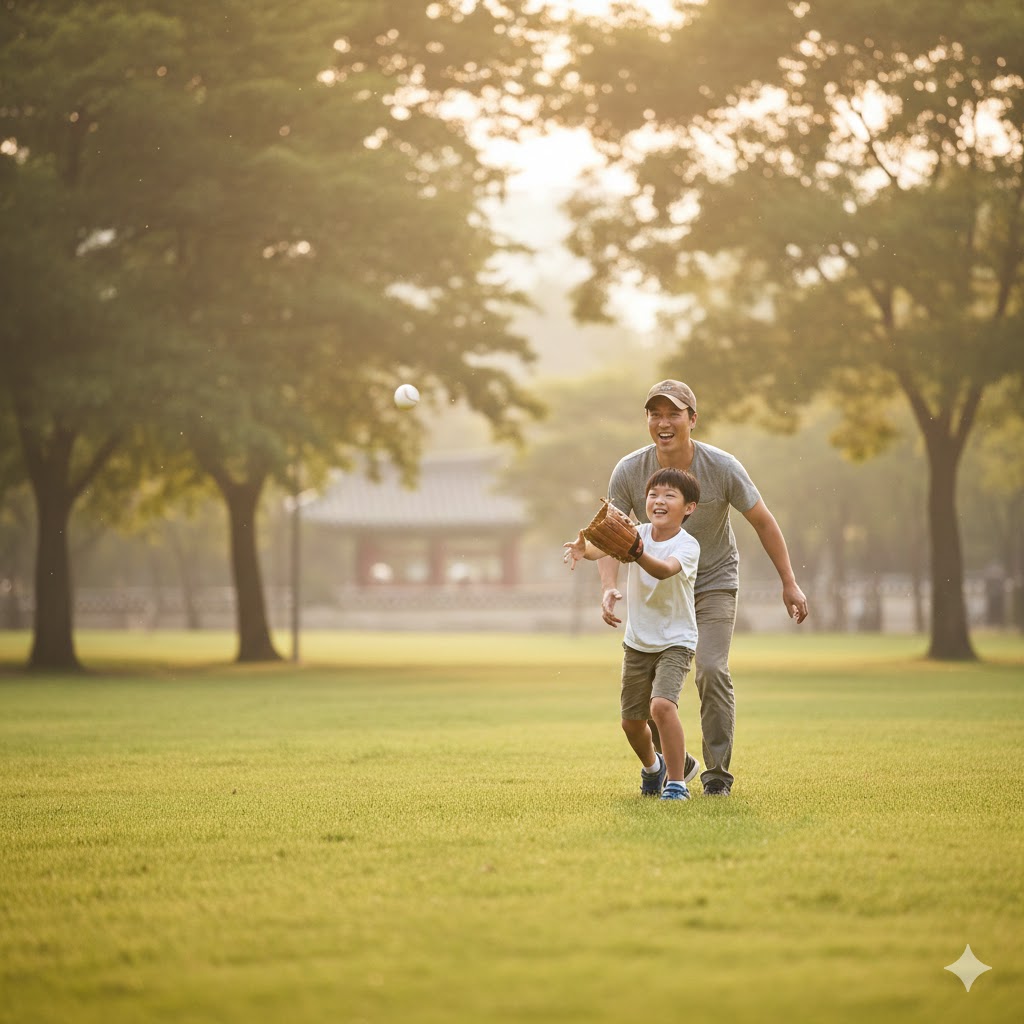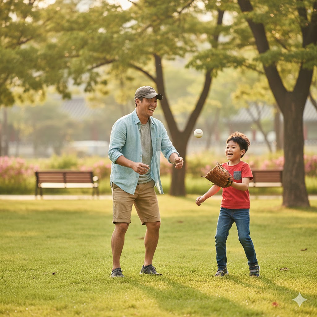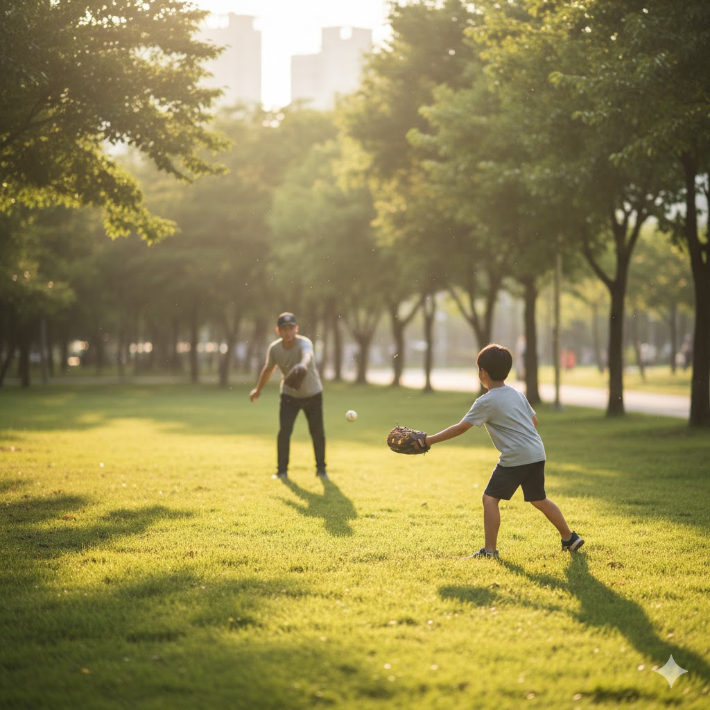 캐치볼을 하는 아빠와 아들의 모습을 사실적으로 묘사한 샷. 따뜻한 햇살을 받으며 아빠가 아들에게 공을 던지는 모습. 오후의 햇살이 나뭇잎 사이로 부드럽게 쏟아져 들어오는 서울의 한적한 공원을 배경으로 한다. 햇빛은 부드럽고 따뜻한 분위기를 연출하며, 풀밭의 녹색과 인물들의 움직임을 강조한다. 망원 렌즈로 촬영하여 배경은 부드럽게 흐려지고, 캐치볼의 역동적인 순간에 초점을 맞춘다.