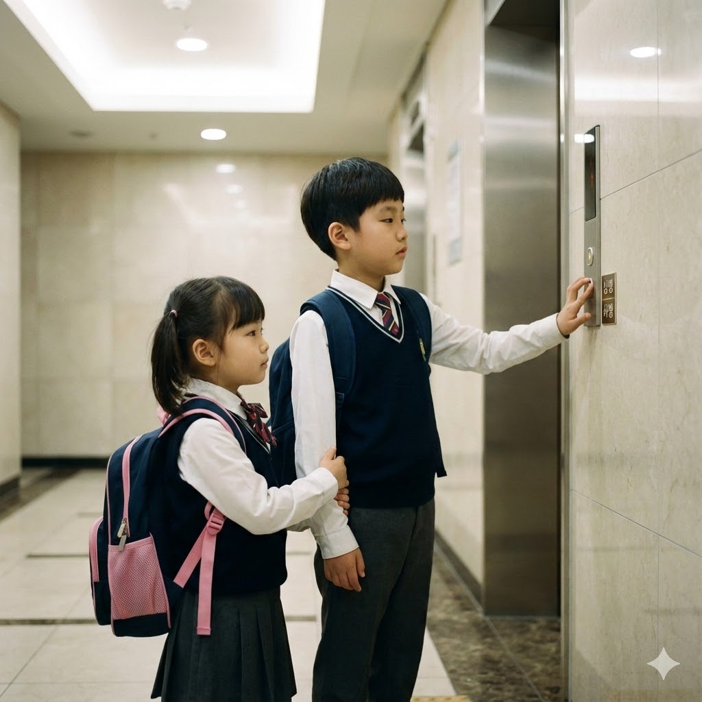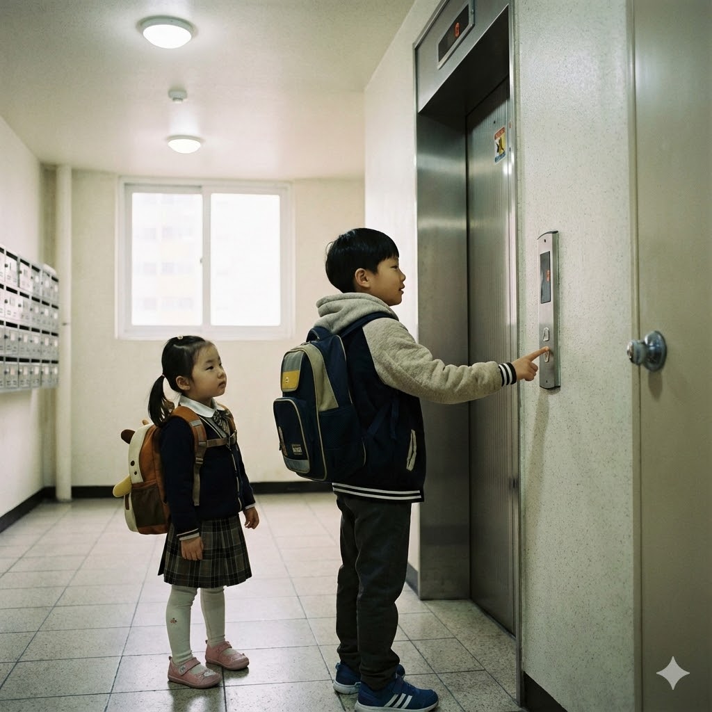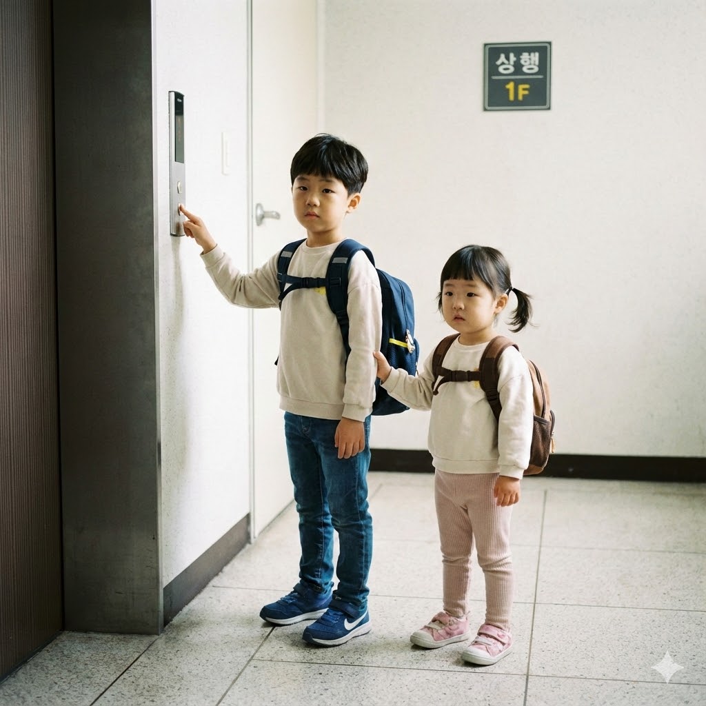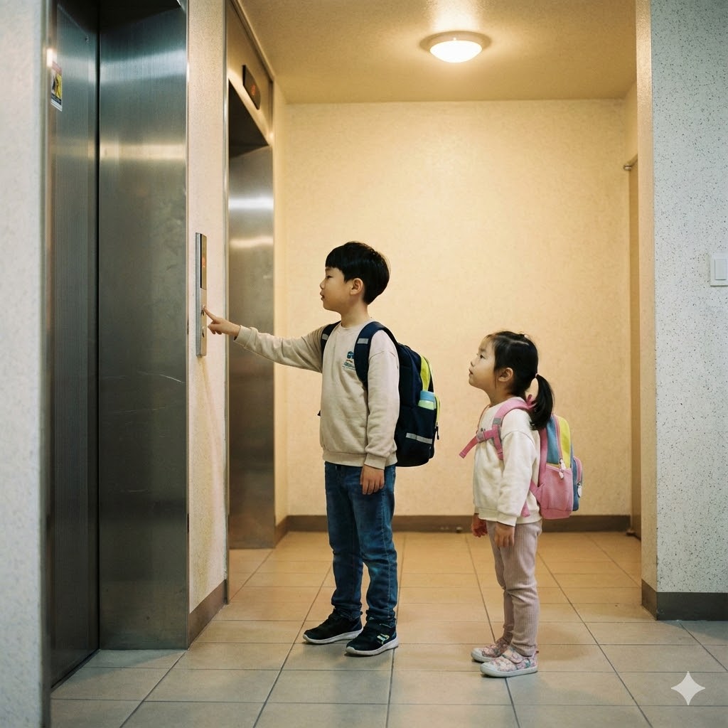 한국의 한 아파트 현관의 엘리베이터 문 앞에서, 엘리베이터 버튼을 누르는 초등학생 오빠와 기다리는 유치원생 여동생이 책가방을 메고 있는 사실적인 장면. 부드러운 실내 조명으로 비춰져 평화로운 분위기를 자아낸다. 50mm 표준 렌즈로 촬영하여 아이들의 순수함과 일상적인 순간을 강조한다.