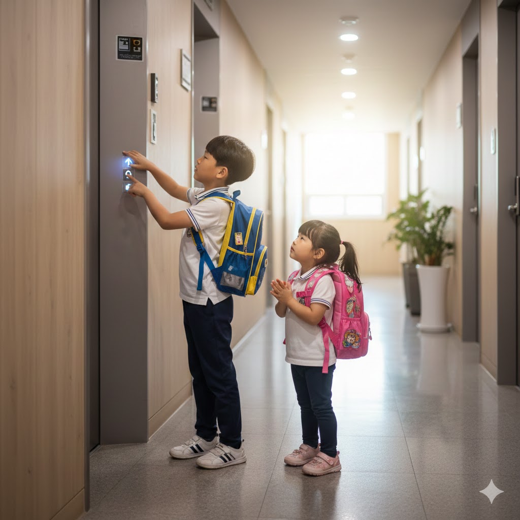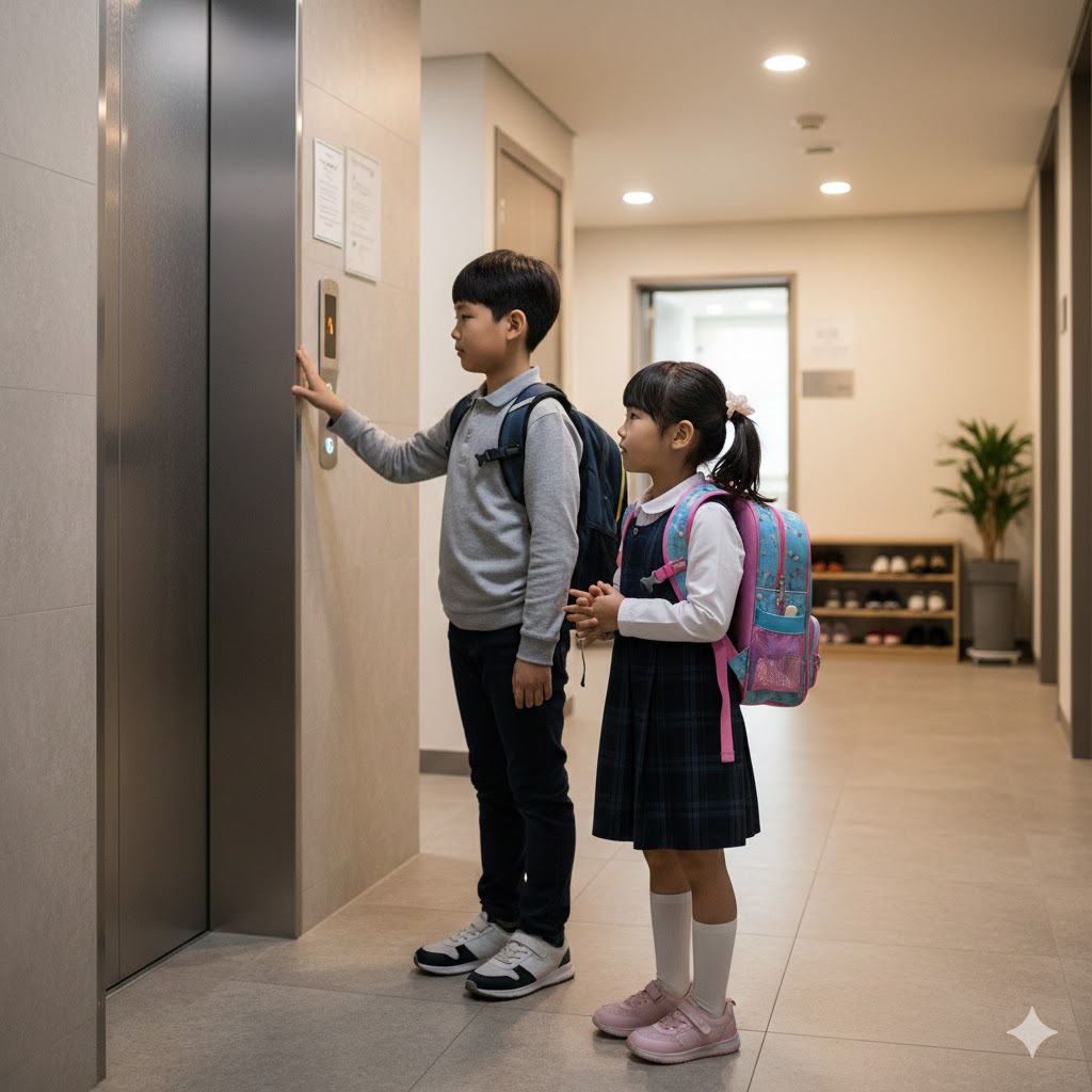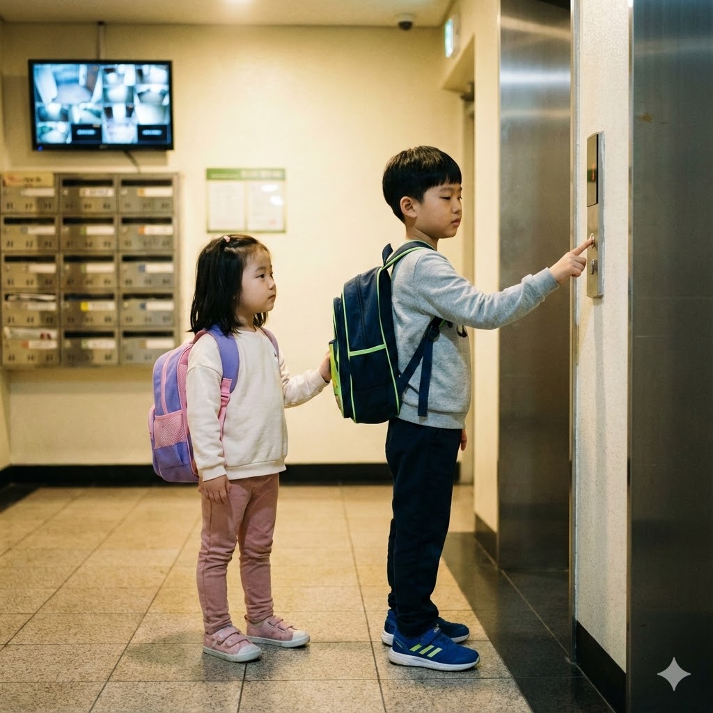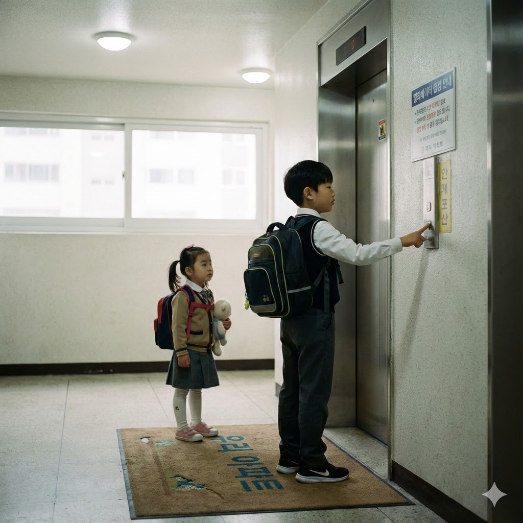 한국의 한 아파트 현관의 엘리베이터 문 앞에서, 엘리베이터 버튼을 누르는 초등학생 오빠와 기다리는 유치원생 여동생이 책가방을 메고 있는 사실적인 장면. 부드러운 실내 조명으로 비춰져 평화로운 분위기를 자아낸다. 50mm 표준 렌즈로 촬영하여 아이들의 순수함과 일상적인 순간을 강조한다.