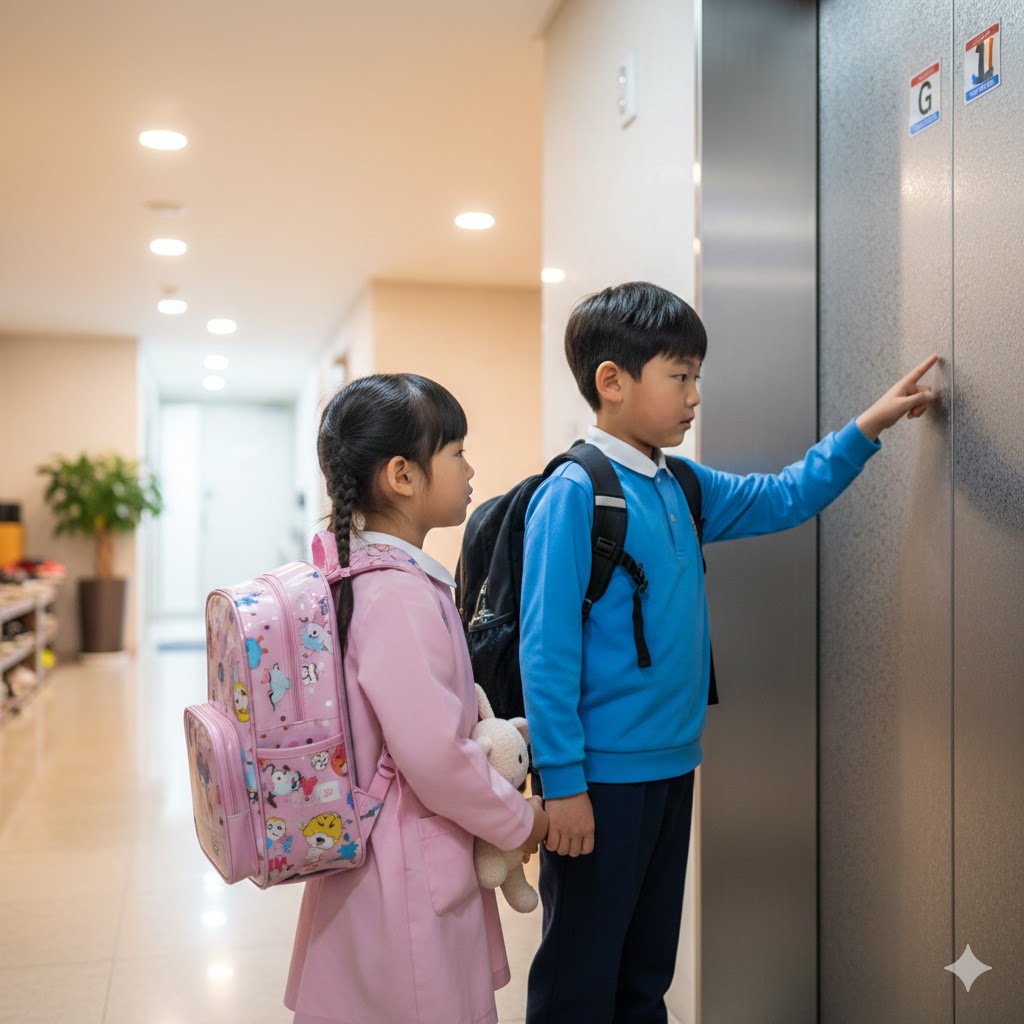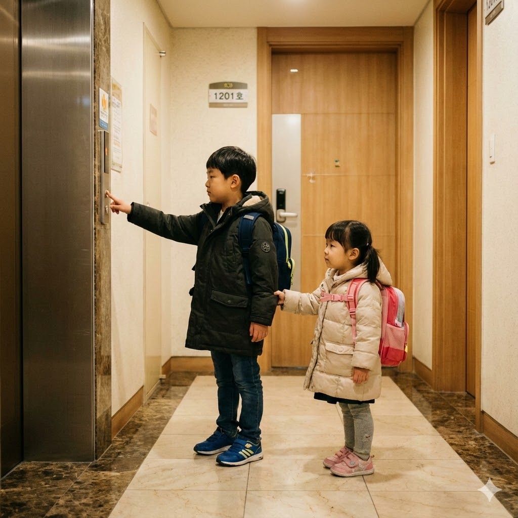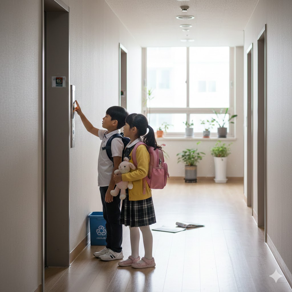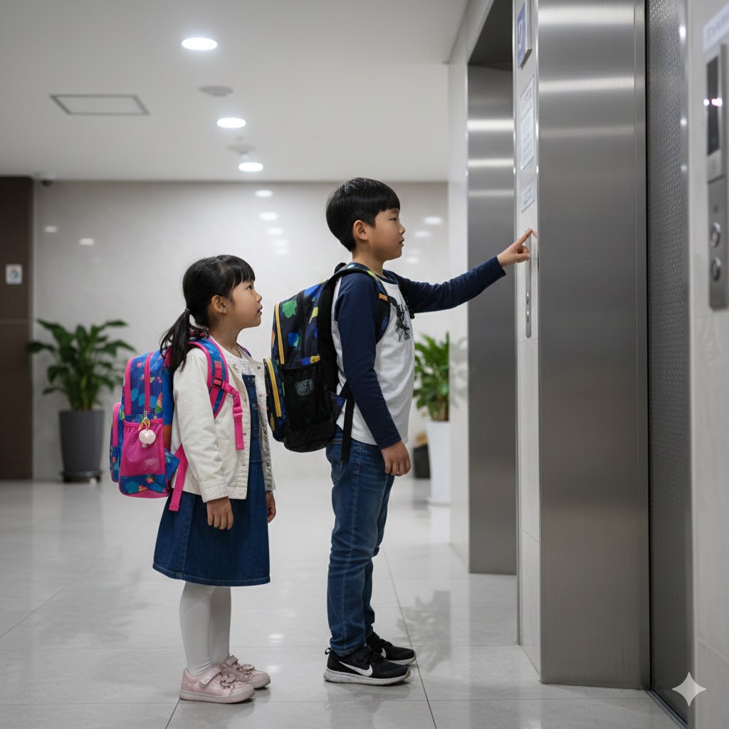 한국의 한 아파트 현관의 엘리베이터 문 앞에서, 엘리베이터 버튼을 누르는 초등학생 오빠와 기다리는 유치원생 여동생이 책가방을 메고 있는 사실적인 장면. 부드러운 실내 조명으로 비춰져 평화로운 분위기를 자아낸다. 50mm 표준 렌즈로 촬영하여 아이들의 순수함과 일상적인 순간을 강조한다.