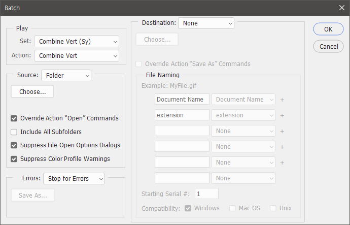 File → Automate → Batch를 실행하고 스샷의 옵션대로 설정 후 실행합니다. 추가로,