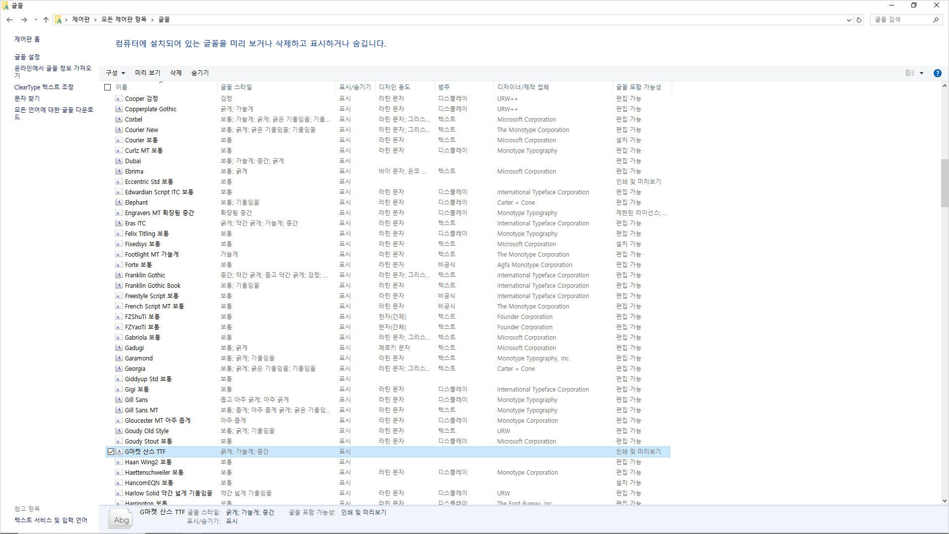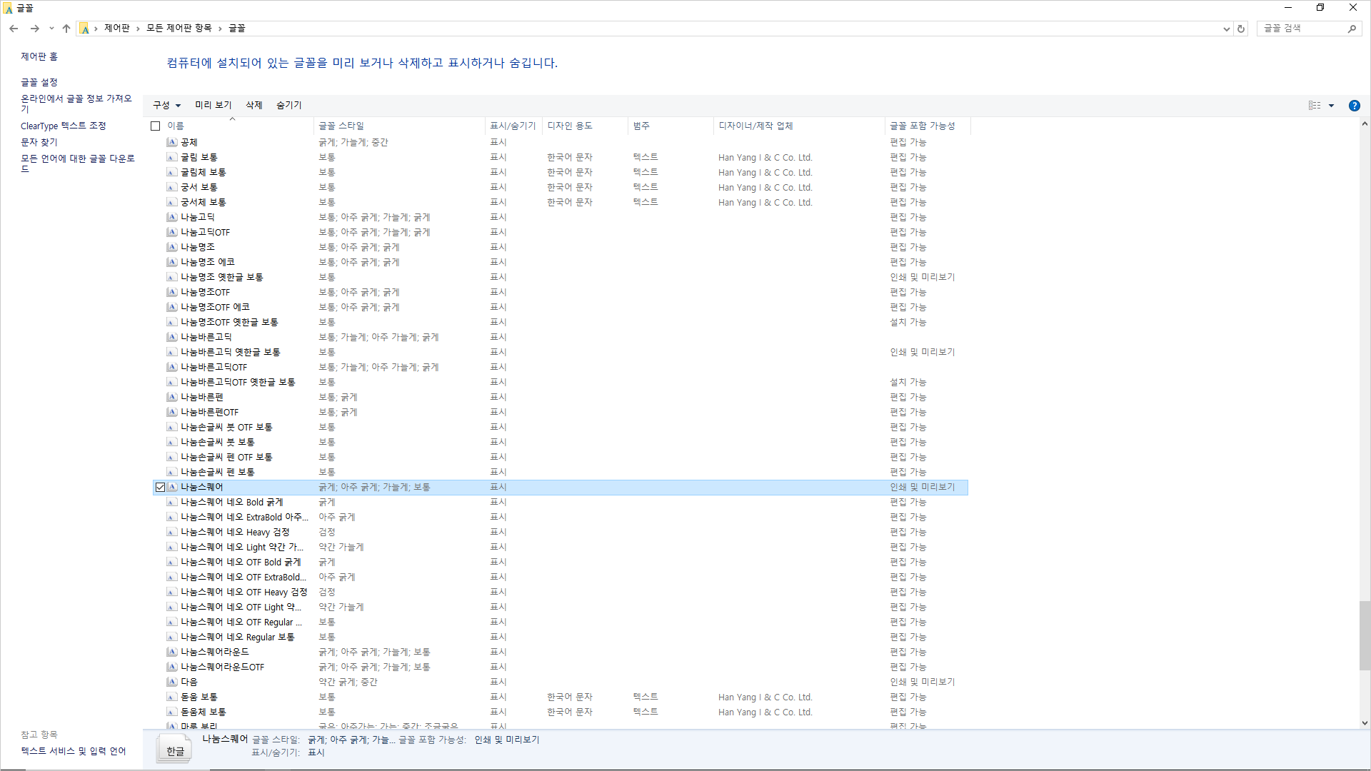 2) '인쇄 및 미리보기' 속성을 가진 폰트에서 발생하는 문제 유형입니다.
